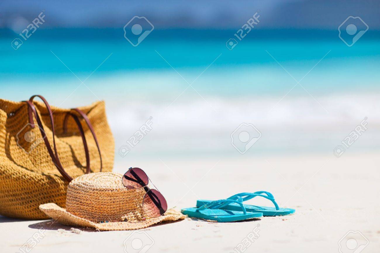 Straw Hat, Bag, Sun Glasses And Flip Flops On A Tropical Beach ...